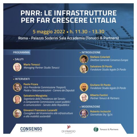 Di questi temi si parlerà il 5 maggio al tavolo di lavoro dal titolo “PNRR: Le infrastrutture per far crescere l’Italia”, organizzato da Consenso Europa in collaborazione e con Tonucci & Partners e Studio Legale Di Pardo.
