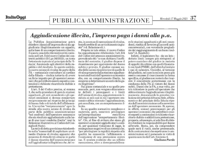 Il contributo dell’Avv. Giuliano Di Pardo su ItaliaOggi su #codiceappalti: la #PA potrà chiedere i danni all’impresa che si aggiudica illegittimamente un appalto. Ma cosa si intende per “comportamento illecito”? e per “azione di rivalsa”?